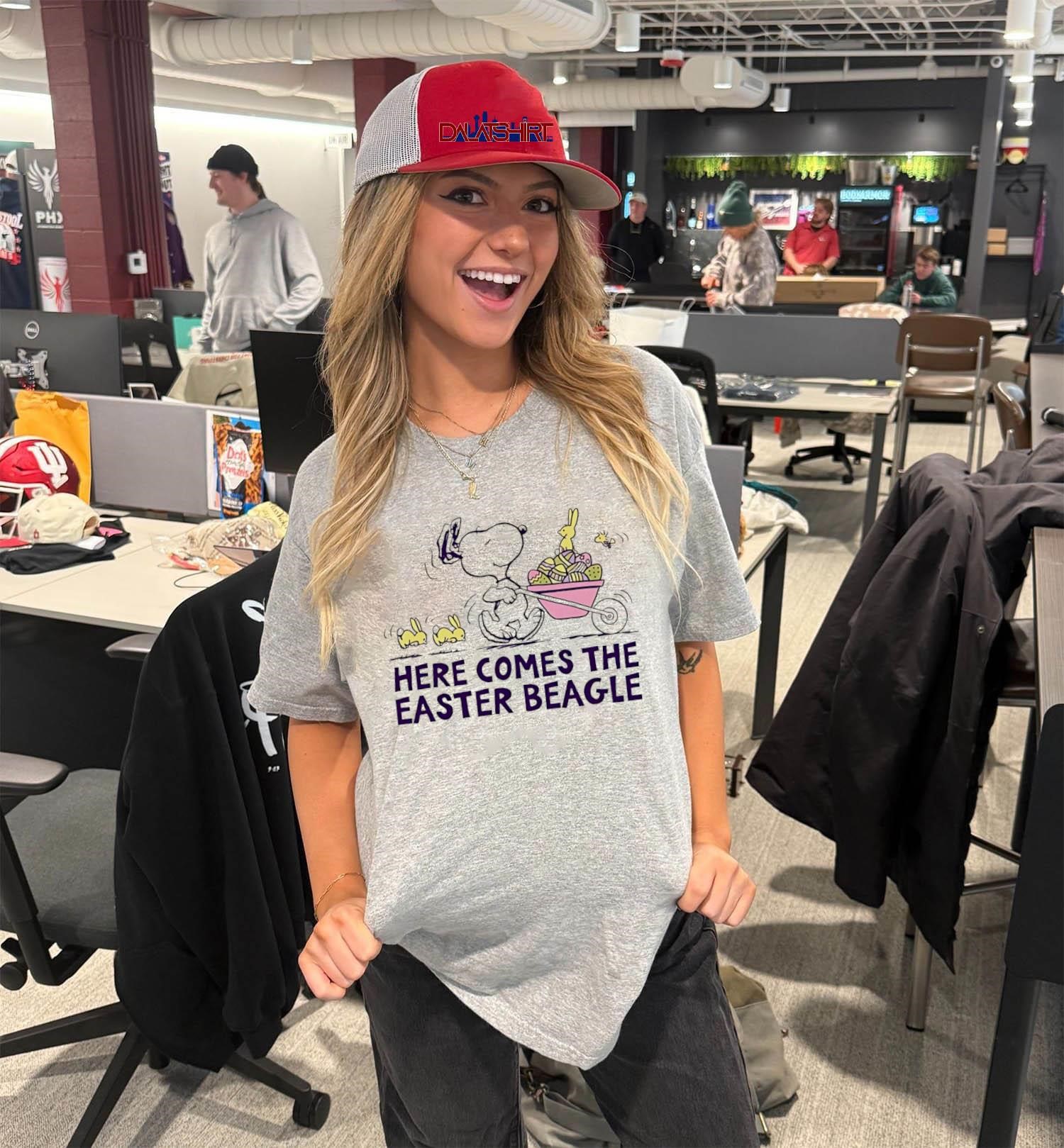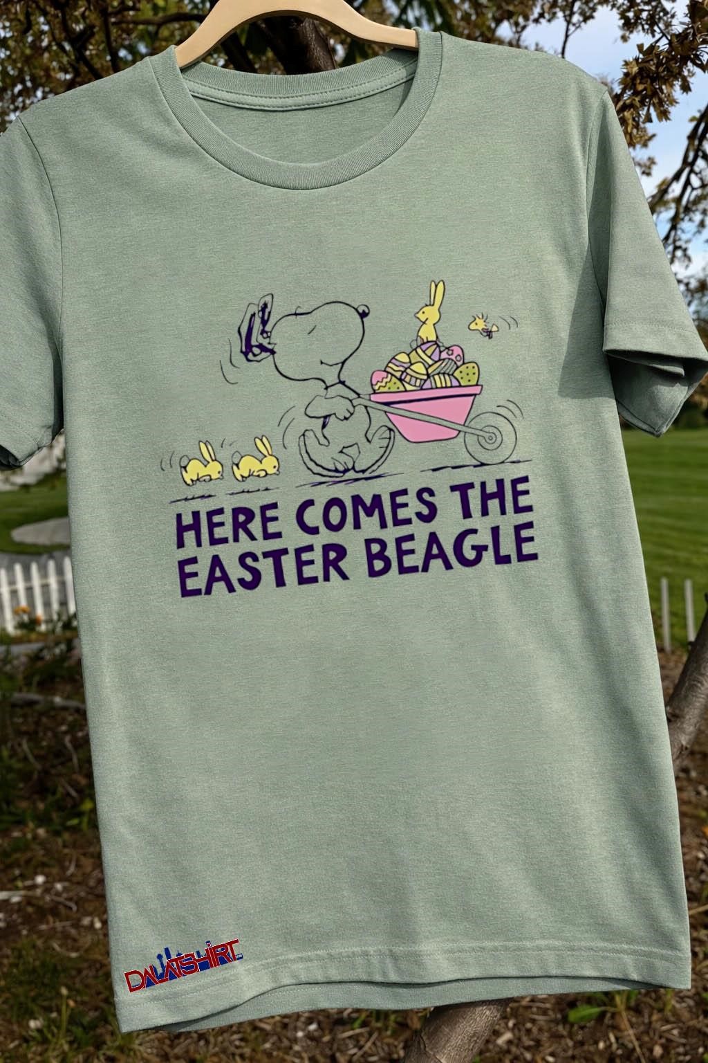The Snoopy here comes the easter beagle shirt is more than just a piece of clothing; it’s a nostalgic nod to a beloved cartoon and a celebration of Easter. This simple t-shirt, typically featuring Snoopy in an Easter-themed design, is often seen around the Easter holiday, enjoyed by kids of all ages. The design usually depicts Snoopy as the Easter Beagle, a character that makes seasonal appearances, spreading joy through the world of “Peanuts”.