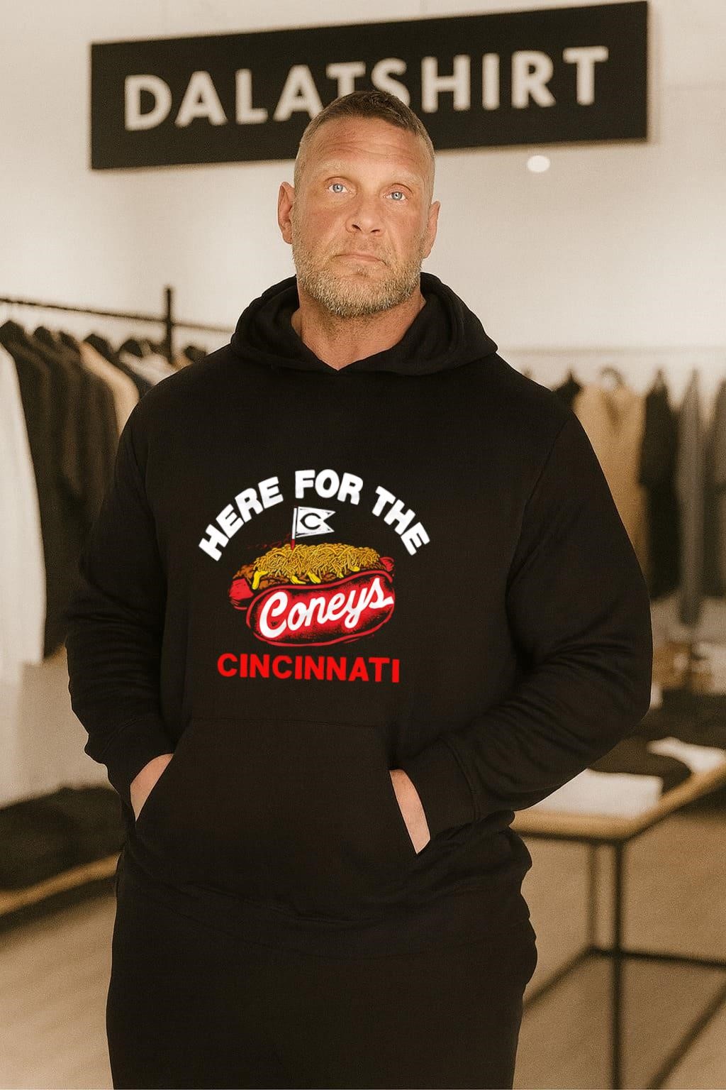 The Here For The Coneys Cincinnati Reds Hot Dog shirt is a piece of wearable fan art that celebrates two of Cincinnati’s greatest loves: its baseball team and its distinctive chili-topped hot dogs. It’s a statement piece, a conversation starter, and a comfy reminder of good times. Whether you’re at the ballpark, a chili parlor, or just kickin’ it at home, this shirt lets you wear your passion on your sleeve. The “Coneys” are the best!