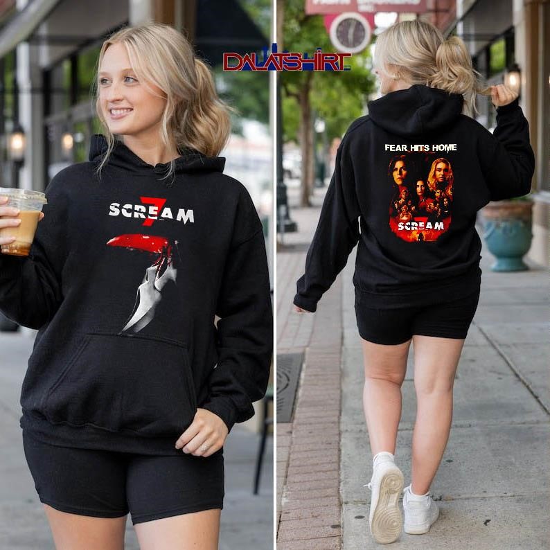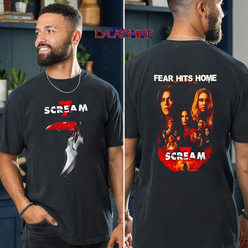 The Scream 7 Fear Hits Home shirt is more than just a piece of clothing; it’s a statement. It’s a way for fans of the “Scream” franchise to declare their bj for the iconic slasher series. This t-shirt embodies the horror, suspense, and self-aware humor that has made “Scream” a cultural phenomenon since the first film’s release in 1996. The shirt typically features the film’s title, a related image, and maybe some of the signature iconography such as the Ghostface mask.