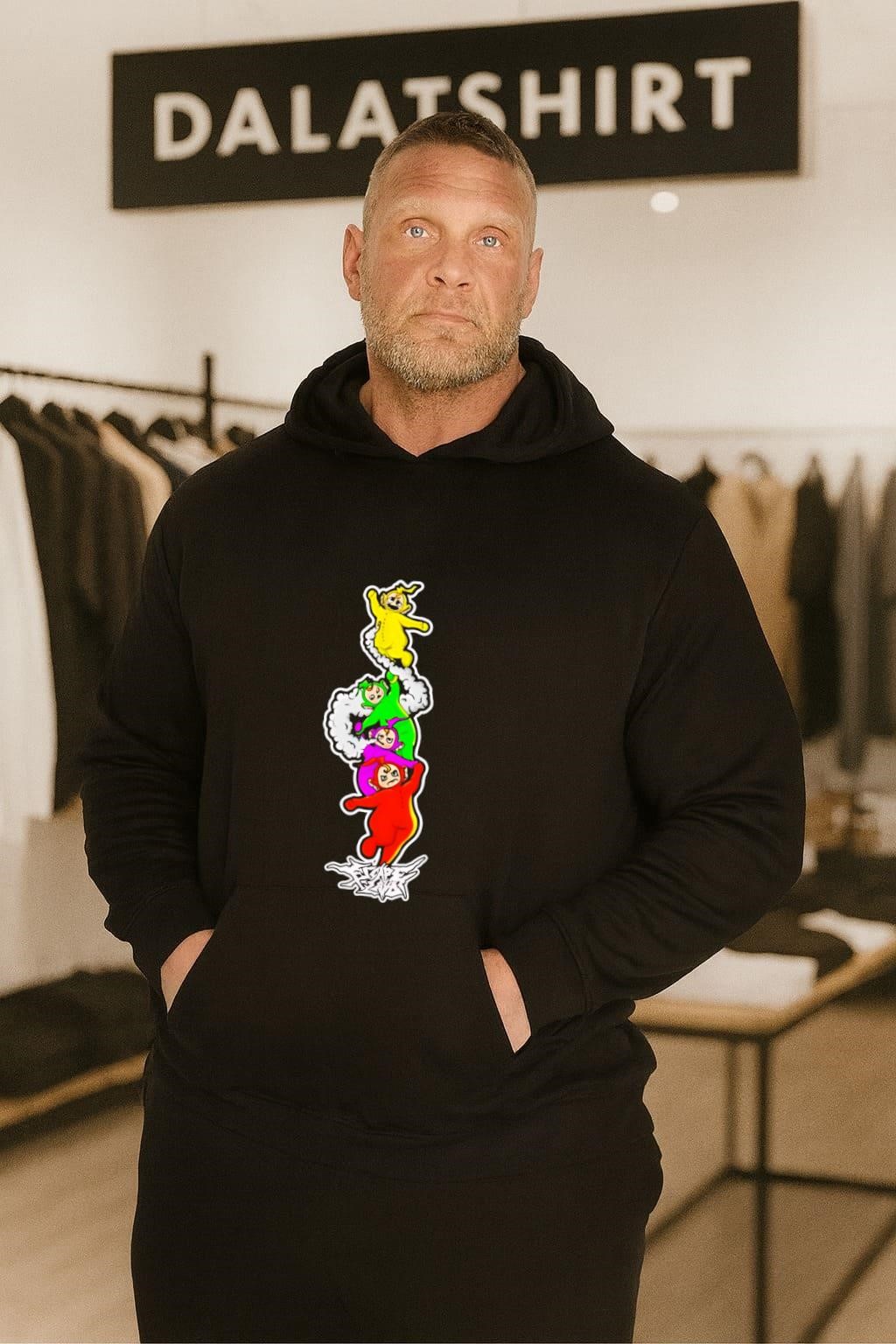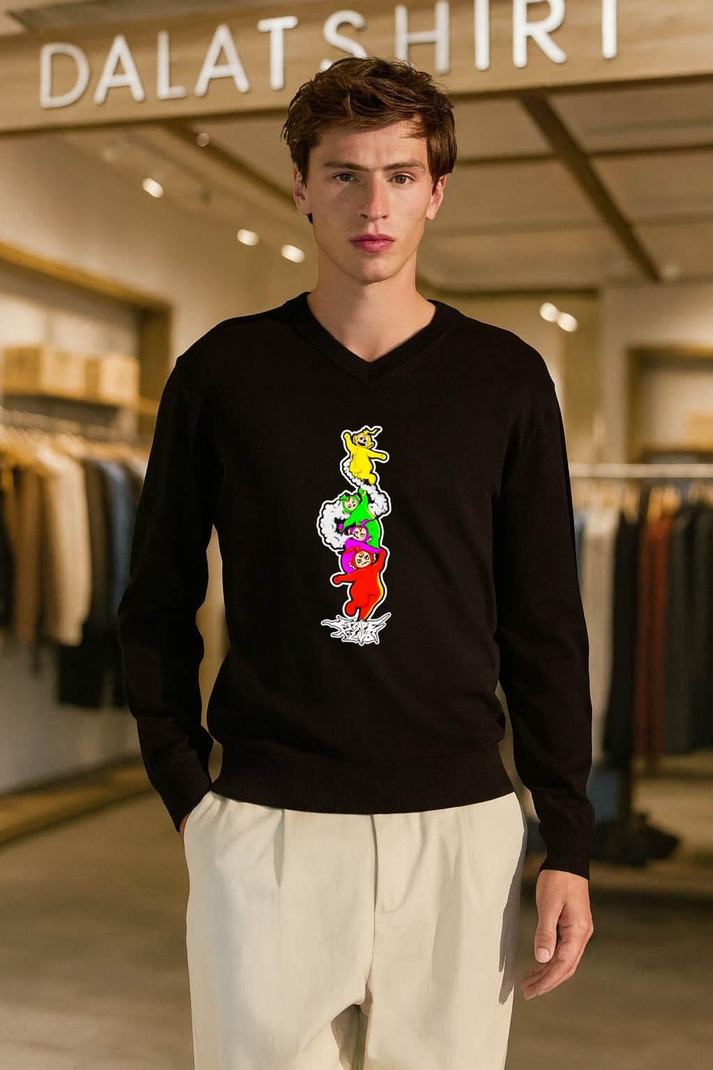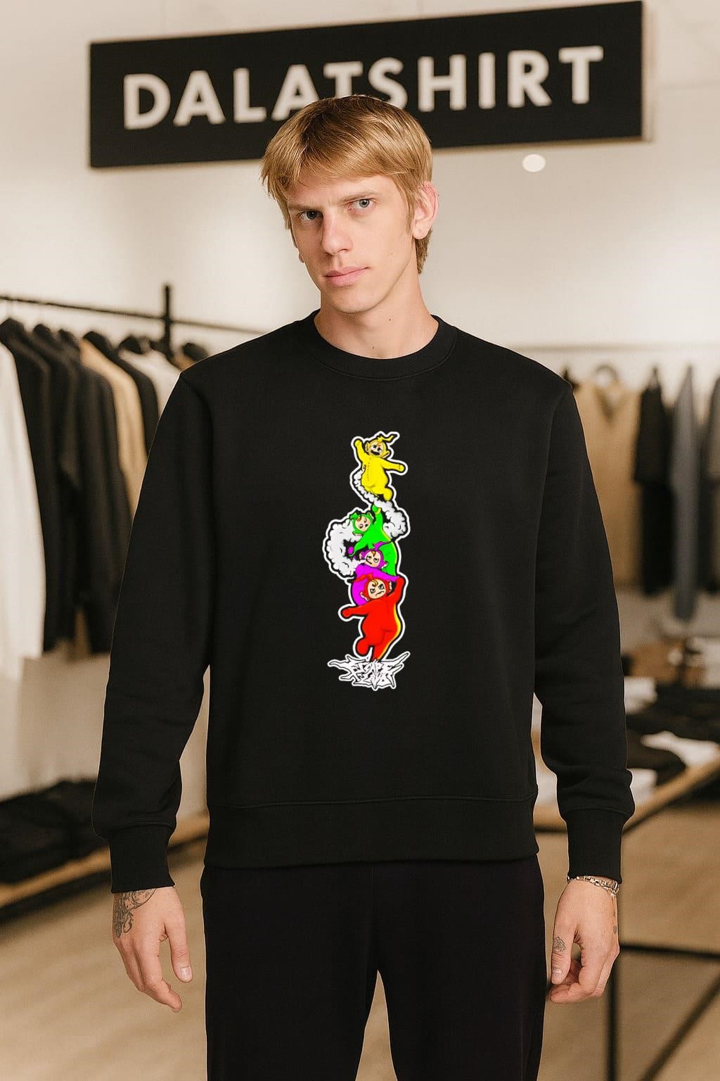The Teletubbies Escape Land Stacked Characters shirt is more than just a piece of clothing; it’s a nostalgic trip back to the hills of Teletubbyland. This shirt features a stacked design of the iconic Teletubbies characters – Tinky Winky, Dipsy, Laa-Laa, and Po – and is made of soft, comfortable fabric. It’s a way for fans, both young and old, to connect with the whimsical world that captured the hearts of millions back in the day and keep it alive today.